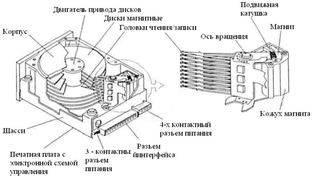 Для того, чтобы отличать оригинальные жесткие диски от фальсифицированных, нужно знать, что из себя представляет исследуемый накопитель информации. Жесткий диск – запоминающее устройство произвольного доступа, основанное на принципе магнитной записи. Типовой накопитель состоит из герметичного корпуса (термоблока) и платы электронного блока. В термоблоке размещены все механические части, на плате — вся управляющая электроника. Внутри термоблока установлен шпиндель с одним или несколькими жесткими пластинами — магнитными дисками, на них записывается и хранится информация [1]. В жестком диске на одной оси используется одна или несколько пластин. На пластины нанесен ферромагнитный материал. Считывание и запись данных осуществляется благодаря магнитной головке в форме крыла, которая крепится на поводок. Когда жесткий диск работает, можно услышать легкое жужжание, которое происходит благодаря вращению дисков. Диски вращаются за счет электромотора так быстро, что создают набегающий поток воздуха, благодаря которому между поверхностью пластины и головкой появляется расстояние, равное примерно 10 нм (нанометрам). В нерабочем состоянии считывающее устройство находится в безопасной зоне у шпинделя, и не соприкасается с магнитным диском. Таким образом, в рабочем и нерабочем состоянии отсутствует механический контакт считывающей головки и пластин, что обеспечивает долгую эксплуатацию жесткого диска. Данное устройство используют совместно с накопителем, приводом и блоком электроники (рис. 1).